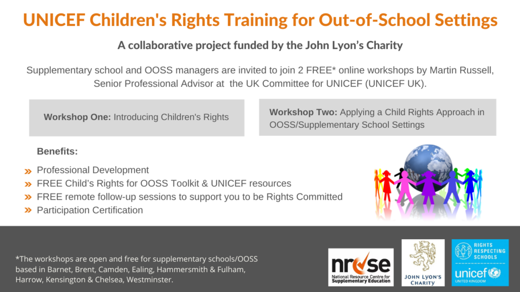 NRCSE is pleased to announce our exciting collaboration with UK Committee for UNICEF (UNICEF UK) to design and deliver FREE* training for supplementary school/out-of-school settings (OOSS) managers and leaders on children’s rights. This new project is funded by the John Lyon’s Charity