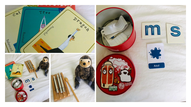 - Showing the box with colouful letters/shapes inside to the kids. Ask one child to take one card and say what colour it is. If it is blue, then ask them to go find an object in blue at their home and show it to the others, then say it in Spanish.