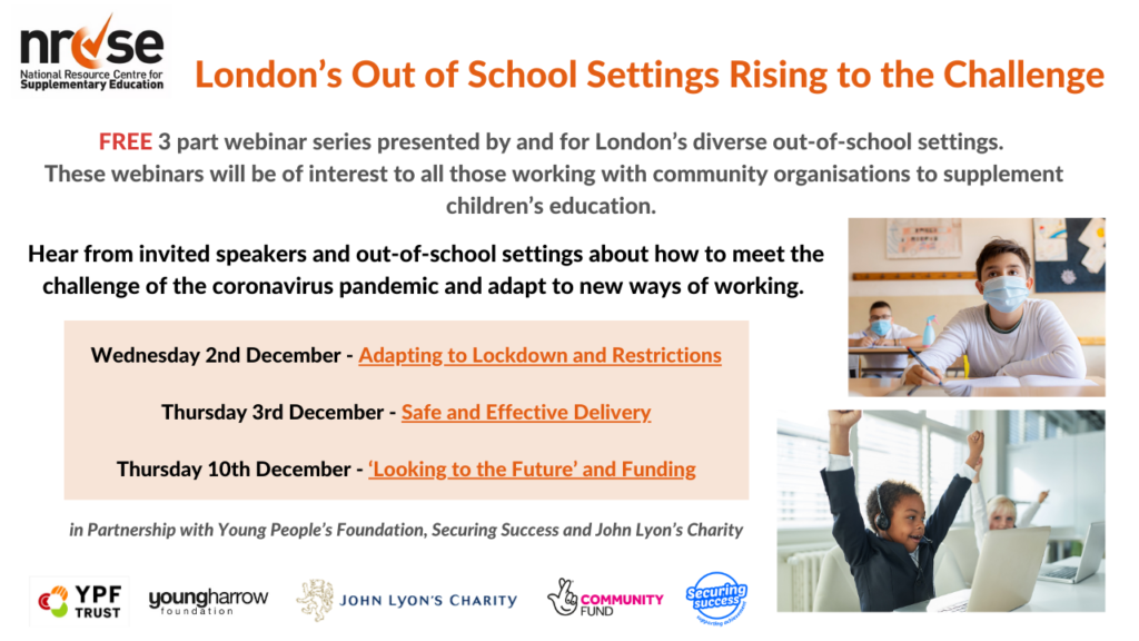 The National Resource Centre for Supplementary Education (NRCSE) in Partnership with Young People’s Foundation, Securing Success and John Lyon’s Charity is pleased to announce a webinar series entitled ‘London’s Out of School Settings Rise to the Challenge’. Presented by and for London’s diverse out-of-school settings offering educational opportunities to children and young people in the capital, these webinars will be of interest to all those working with community organisations to supplement children’s education.